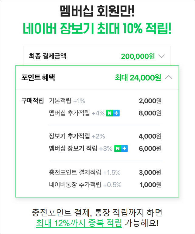 대부분 생필품을 주문할 때가 많고, 쌀이나 김치, 그리고 먹거리도 네이버를 통해서 구입하다 보니, 네이버 포인트를 최대 5배나 더 많이 모을 수 있는 '네이버 플러스 멤버십'을 쓸 수 밖에 없더군요. (출시 초기에는 애매하다는 분석 결과가 많았는데, 네이버가 혜택을 대폭 늘리면서 점점 안하면 바보가 될 정도로 혜자 혜택이 되고 있습니다.)