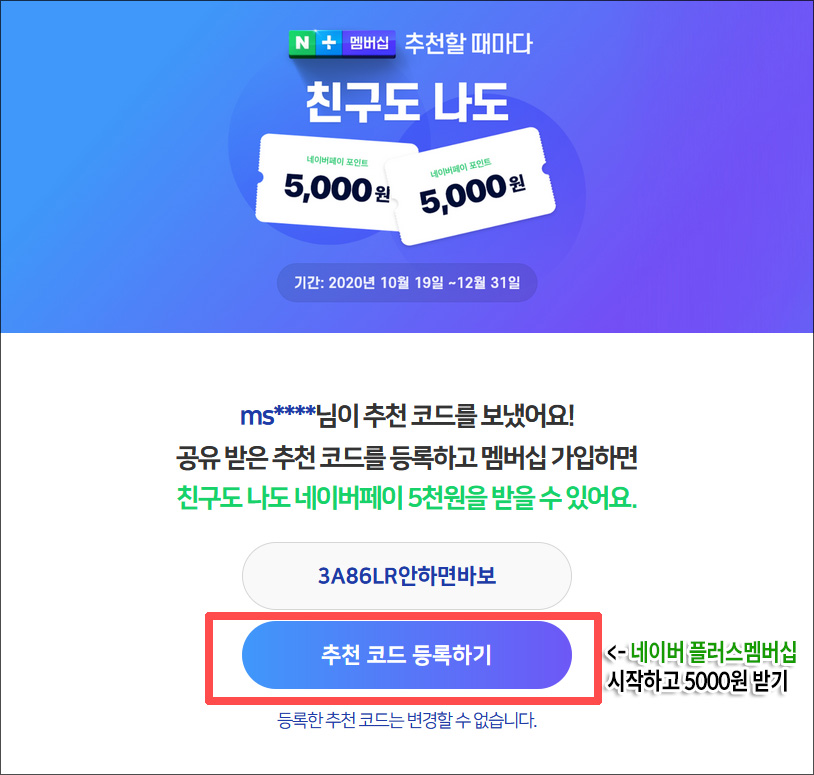 네이버+ 멤버십 친구추천코드 '3A86LR안하면바보'