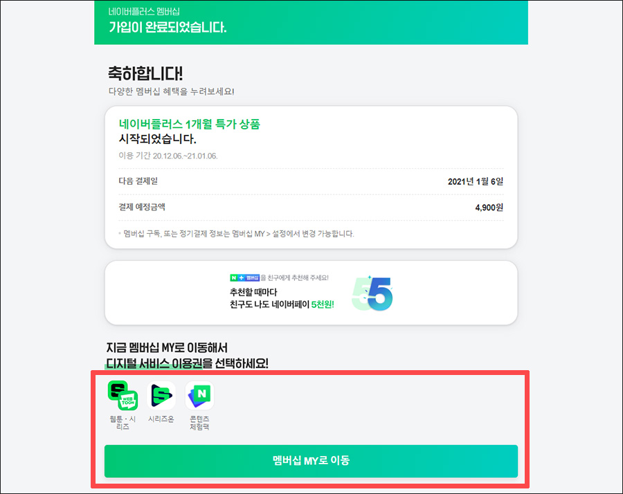 그럼, 네이버 플러스 멤버십 가입을 원하시는데 친구초청 5000원을 추가로 획득하고 싶으신 분들은 아래의 링크를 통해 가입해보세요. 네이버 서비스를 잘 활용하신다면 월 4900원 요금이 아깝지 않습니다. ^^ 저도 매월 1만원 5천원 정도는 항상 이득을 보고 있습니다.