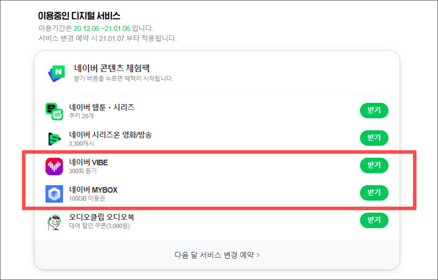 제 경우에는 네이버 웹툰을 잘 안보기에... 가장 많이 사용할 서비스는 네이버VIBE 300곡 듣기와 네이버 MYBOX 100GB 이용권일 것 같네요.