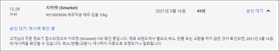 저는 보이시는 것처럼 시험삼아 지마켓에서 감귤 10kg를 사봤는데요. 적립금 49원이 모인것을 확인할 수 있더군요.