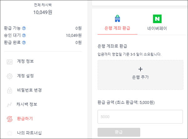 요즘에는 네이버페이(NaverPay)로도 환급이 가능하더군요. 5000원만 모이면 환급을 받을 수 있으니 개꿀입니다. ^^