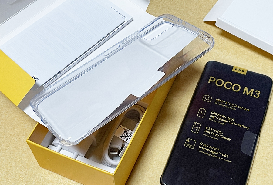 자세히 보면 젤리 투명 케이스도 포함되어 있고, USIM 트레이를 뽑는 핀이 보입니다. 샤오미 포코M3는 듀얼 유심, 그리고 microSD메모리 슬롯을 지원합니다.
