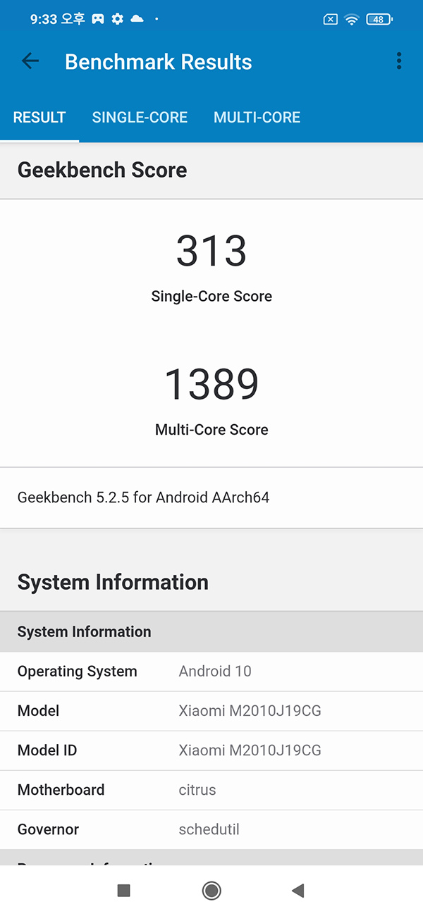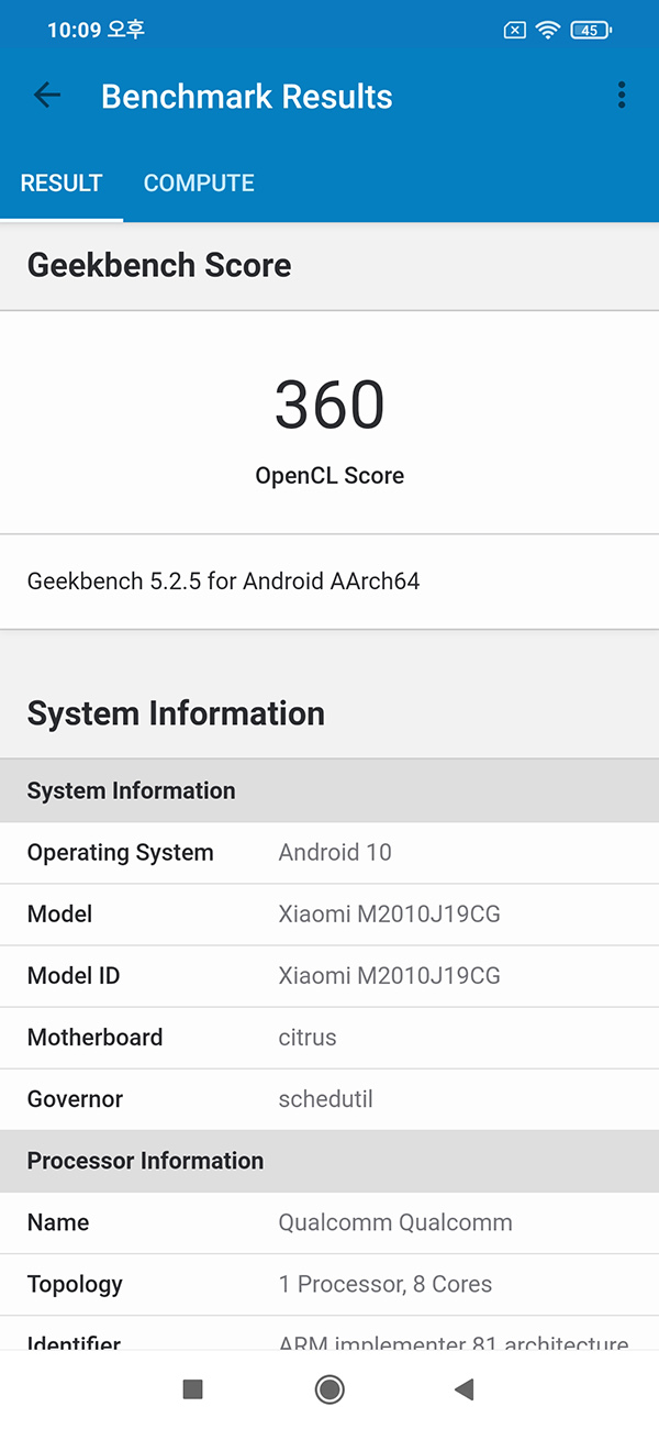 멀티코어 점수 1389점, OpenCL 점수는 360점이 나오네요. 보급형 다운 성능입니다. 게임을 돌리는 것은 쉽지 않겠지만, 카톡이나 페메같은 간단한 메시징이나 사진영상 촬영은 거뜬해보이네요.
