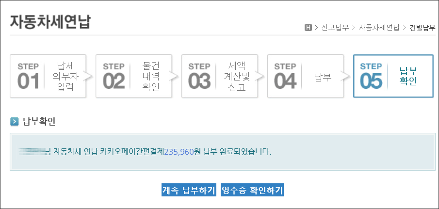 결제완료, 235,960원을 냈습니다. 자동차는 역시 부자들만 끌고 다닐 수 있는 것 같아요. 처음 중고차를 사서 보유한 입장에서.... 너무 세금이 높네요 ㅠ