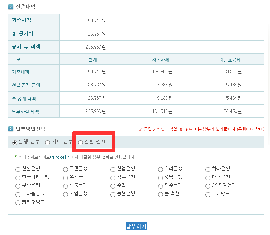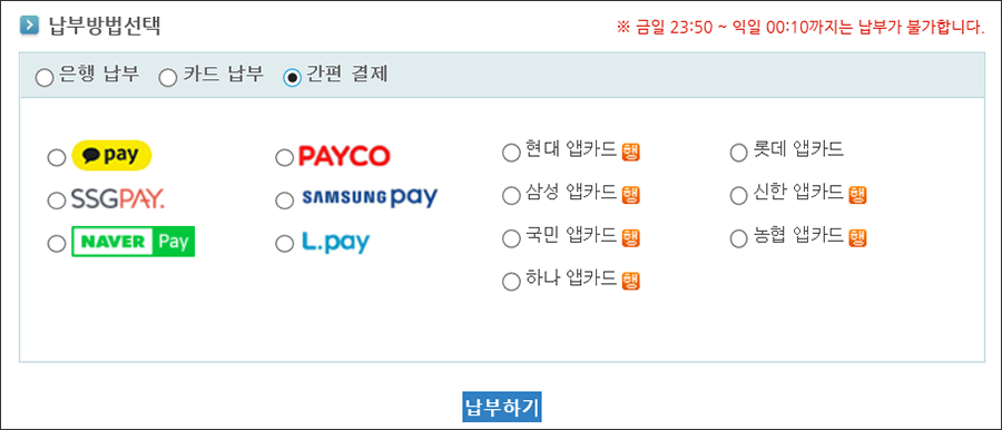 은행으로 납부하는 거는 왠지 손해보는 기분이고, 요즘 이벤트를 많이 하고 있는 간편결제를 선택합니다. 네이버페이, 카카오페이, 페이코 등등