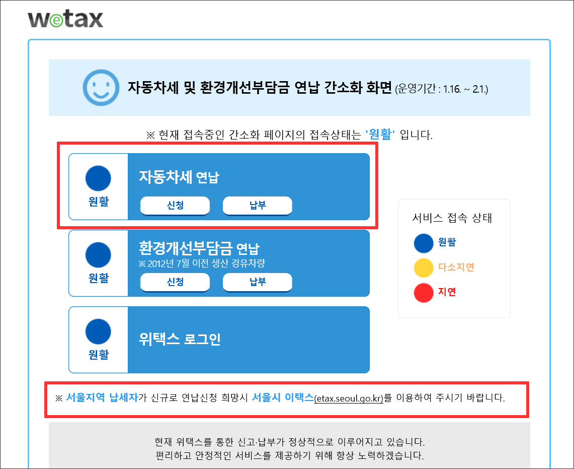 로그인 이후에 메인화면을 보니, 바로 '자동차세연납신청'이라는 아이콘이 잘 보이는 곳에 보이는군요. 클릭해서 들어가보니...