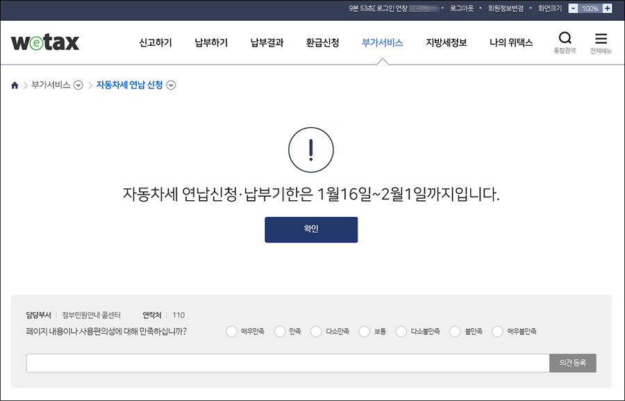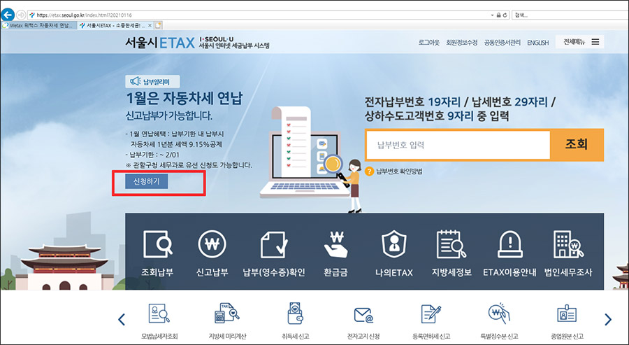 로그인 이후에 메인화면을 보니, 바로 '자동차세연납신청'이라는 아이콘이 잘 보이는 곳에 보이는군요. 클릭해서 들어가보니...