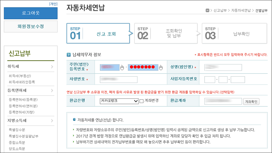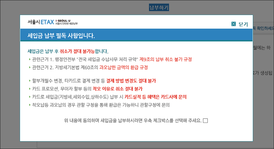 세금이라서 어떠한 착오로 인한 환불은 처리해주지 않는다고 경고가 뜨네요.