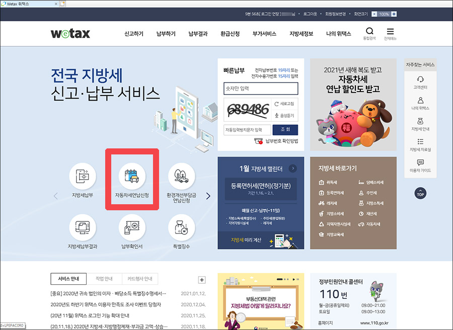 etax로 왔습니다. 로그인하고 나니 역시 메인 페이지에 '자동차세 연납'이 떠있네요.
