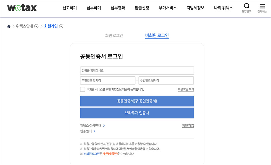 위택스를 검색해서 들어간 다음, 처음에는 몰라서 그냥 비회원 로그인을 하려고 했습니다. 이제는 공동인증서로 바뀐 공인인증서로 혹시나 로그인이 될까 해서요. 인증서로 로그인을 해보니 이미 회원가입이 되어 있다고 바로 연결이 되네요 ^^
