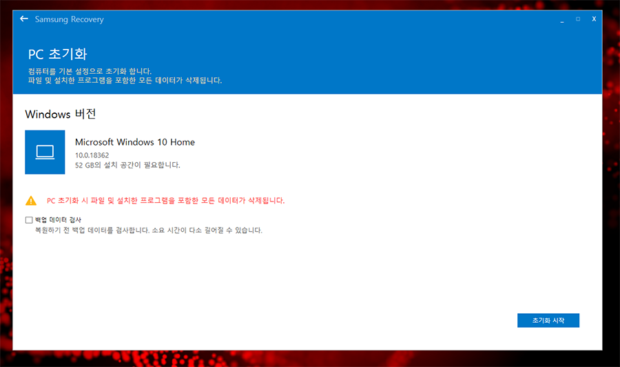 복구를 하기로 결정했다면, 모든 파일들이 다 삭제된다는 것을 유념하시기 바랍니다.