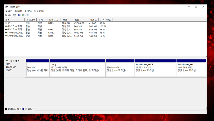 위와같이 C: 이외에도 숨겨진 시스템 파티션으로 Samsung_Rec2, Samsung_Rec와 같은 복구 영역이 있는지 확인해보세요. ^^