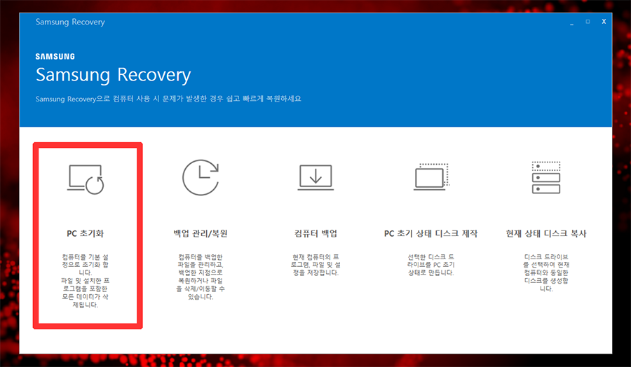 삼성 아티브, 오디세이, 갤럭시북, 이온 플렉스 등등의 삼성 브랜드 노트북은 대부분 복구영역에 초기화 기능을 가지고 있습니다.