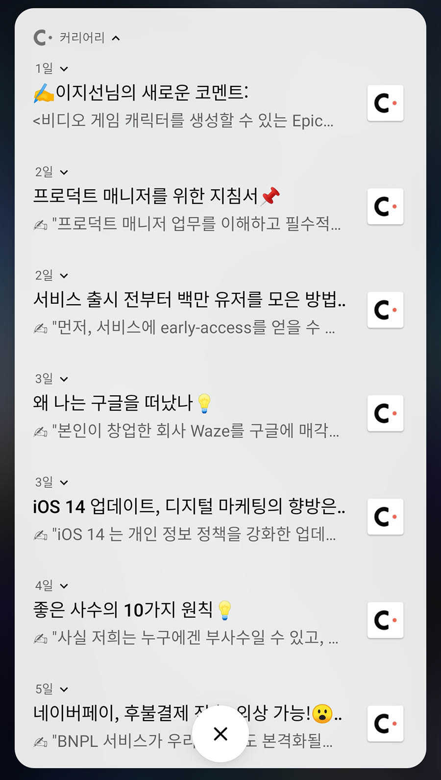 출퇴근 시간이나 잠깐 짬이 날 때, 유능한 PM, PO, 그리고 디자이너들이 추천한 글들을 열람해보는 재미가 쏠쏠 하네요. 커리어리를 사용해보기 시작하셨다면 아래 링크를 통해서 앱을 설치해보시기 바랍니다.
