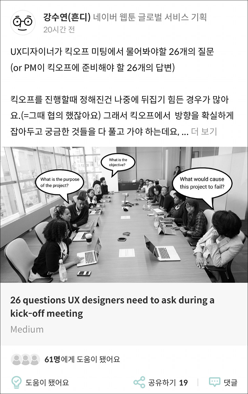 출퇴근 시간이나 잠깐 짬이 날 때, 유능한 PM, PO, 그리고 디자이너들이 추천한 글들을 열람해보는 재미가 쏠쏠 하네요. 커리어리를 사용해보기 시작하셨다면 아래 링크를 통해서 앱을 설치해보시기 바랍니다.