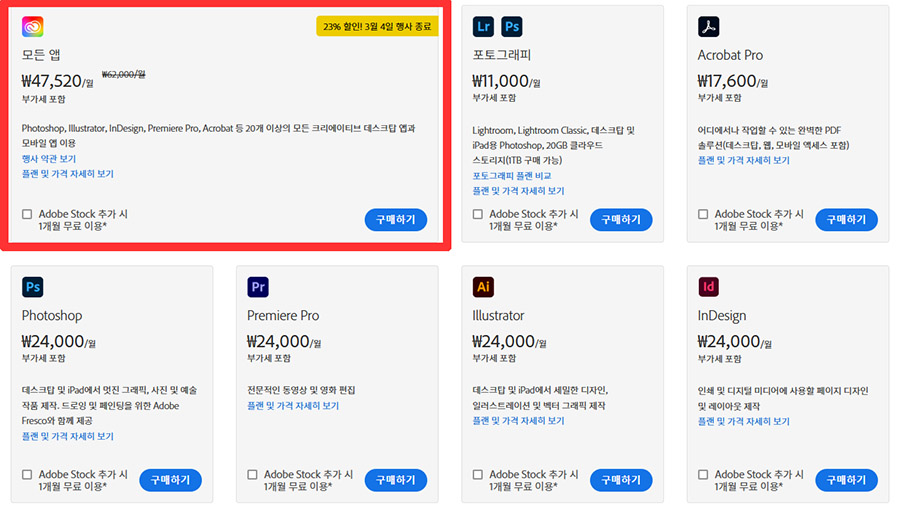 보이시는 것처럼, 개별 앱을 하나씩 구독하면 2만 4000원 이기에, 1개 이상의 어도비 소프트웨어를 사용해야 한다면 무조건 '모든앱'을 선택하는 것이 이득이죠 ^^