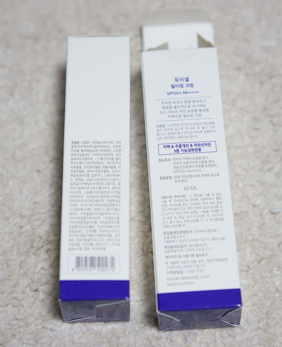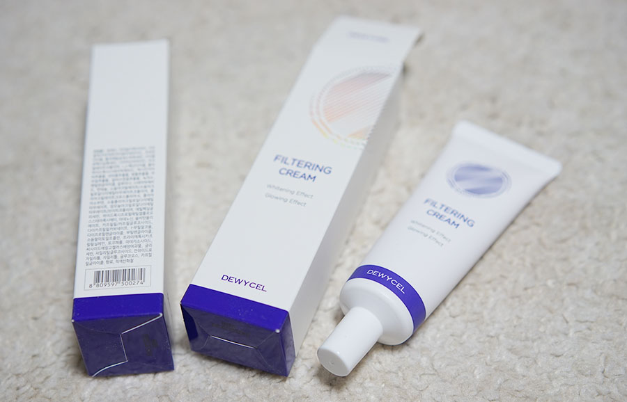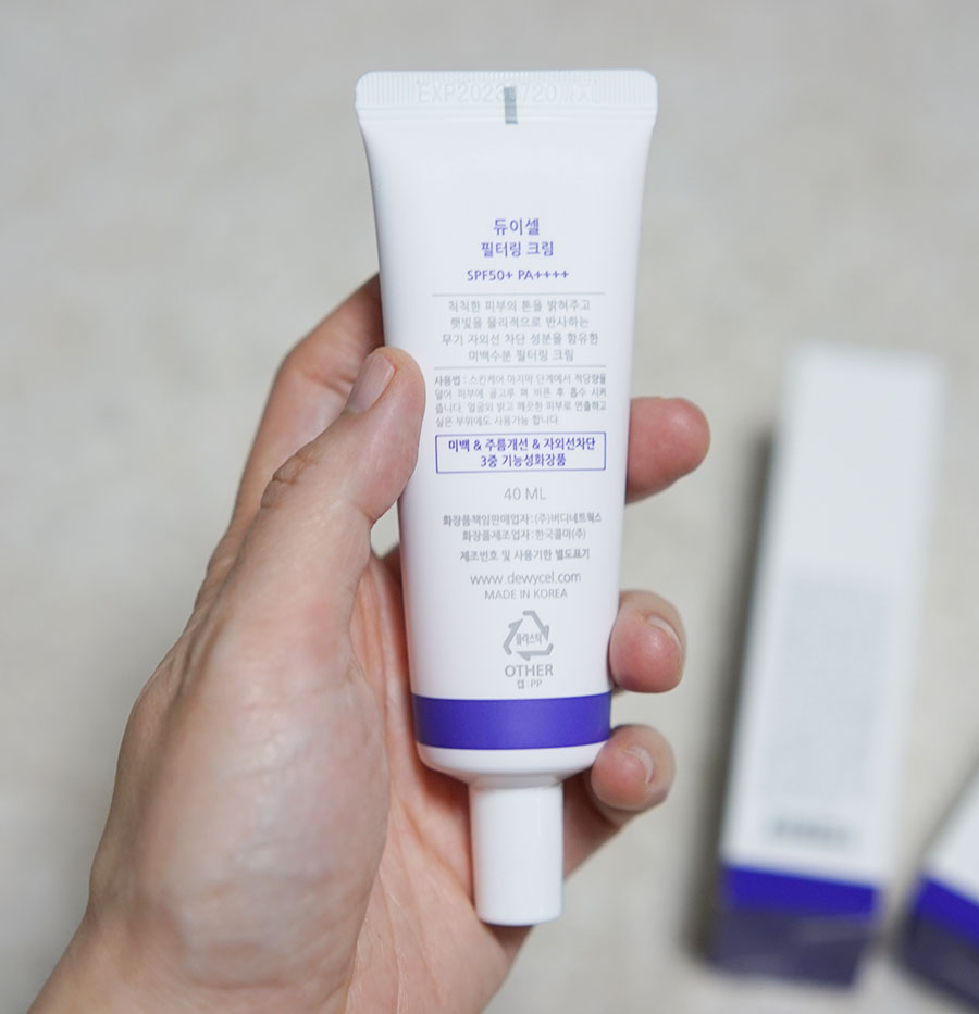 튜브형태의 용기에 들어있는 듀이셀 필터링크림은 미백과 주름개선, 여기에 자외선 차단까지 세 가지 기능을 모두 제공하는 기능성화장품입니다. 무려 SPF50+ PA++++으로 높은 자외선 차단 효과를 갖춰 선블록 대신 듀이셀 필터링크림 하나로 메이크업까지 대신하면 되겠다 싶었습니다.