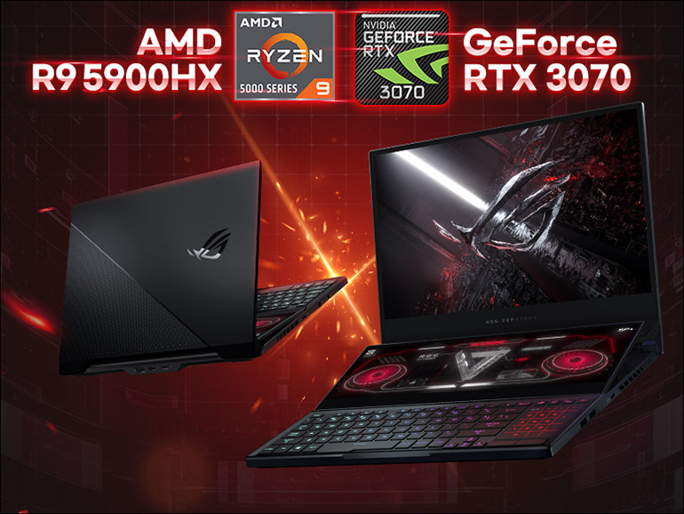듀얼 디스플레이를 가진 ASUS ROG 제피러스 듀오 입니다. AMD 라이젠9 5900HX 프로세서, 지포스 RTX3070 외장그래픽, 램 32GB, 1TB SSD, 300Hz 주사율 그야말로 괴물 노트북입니다.