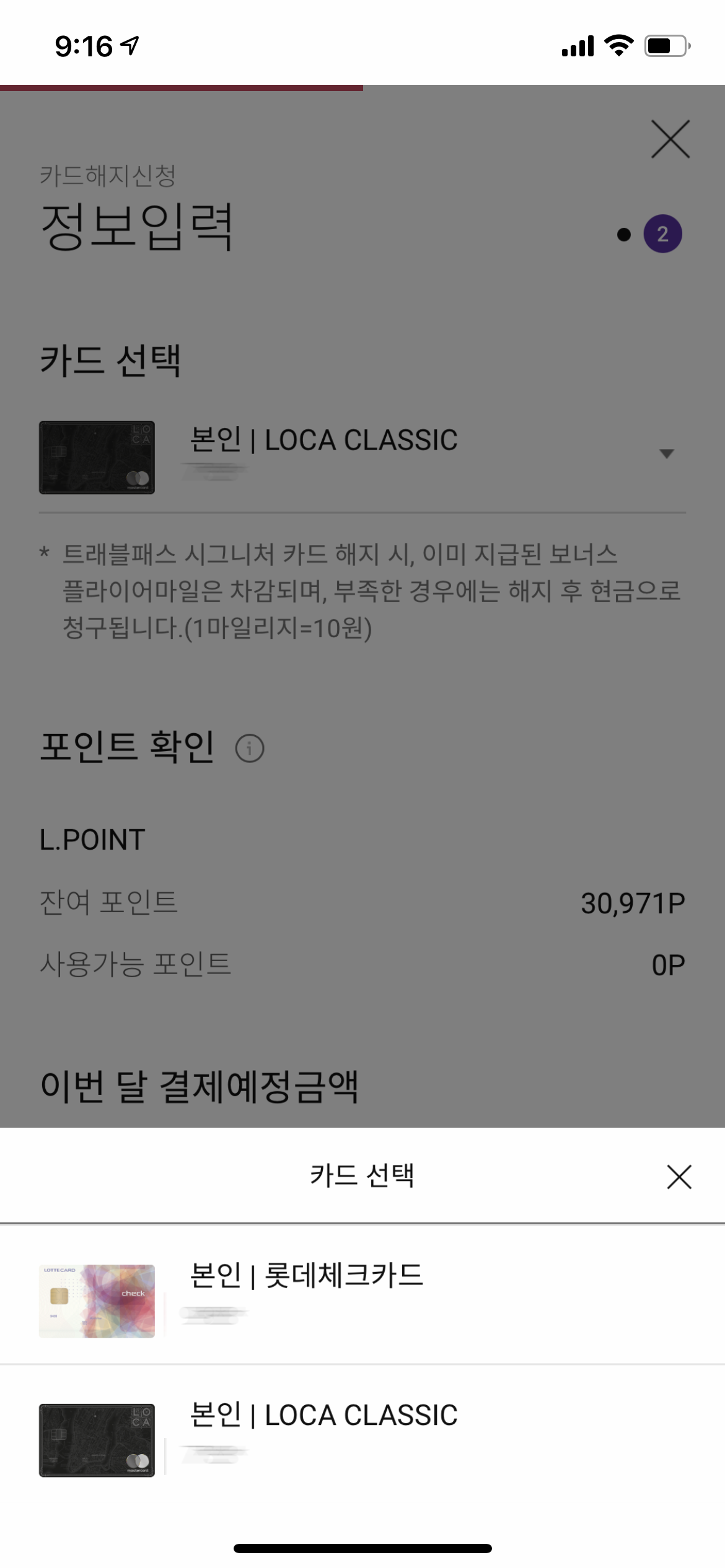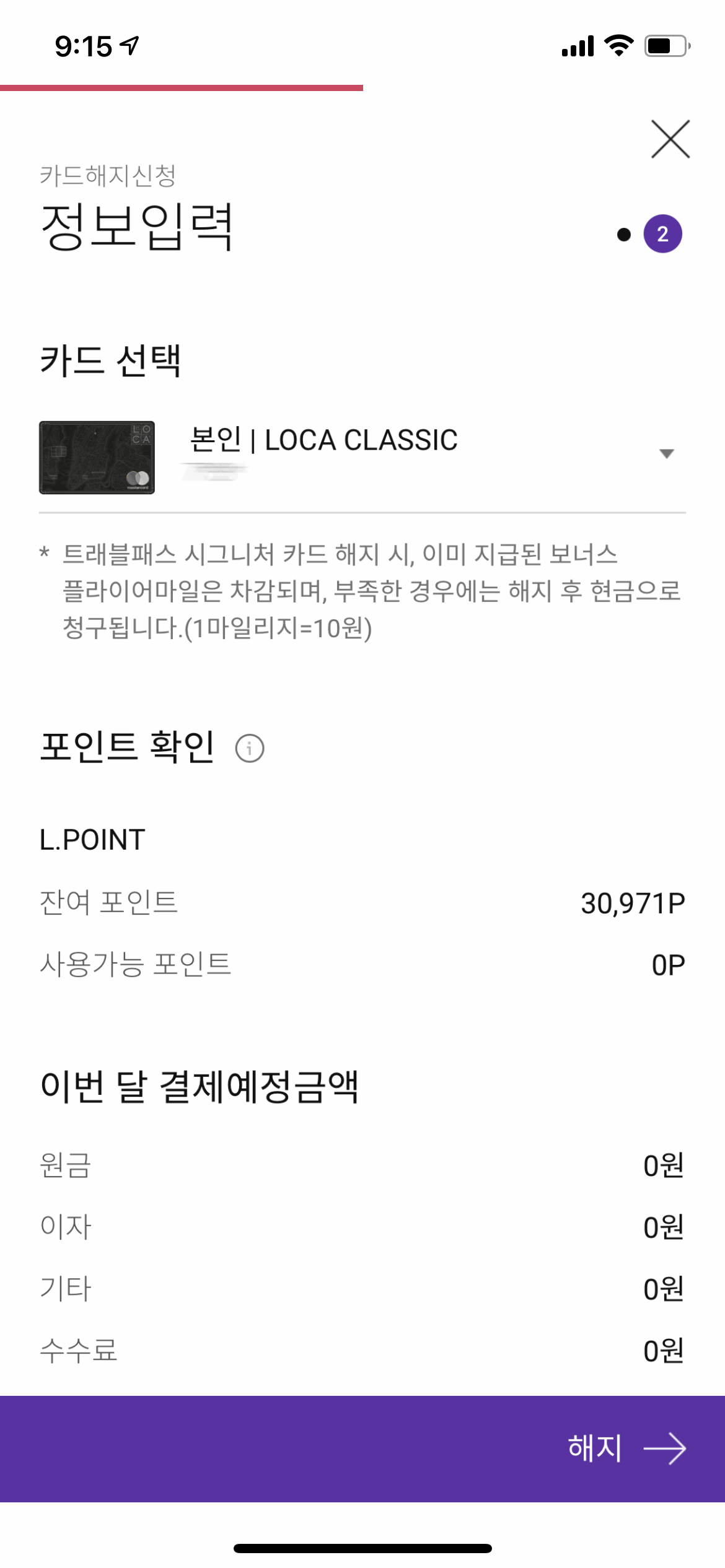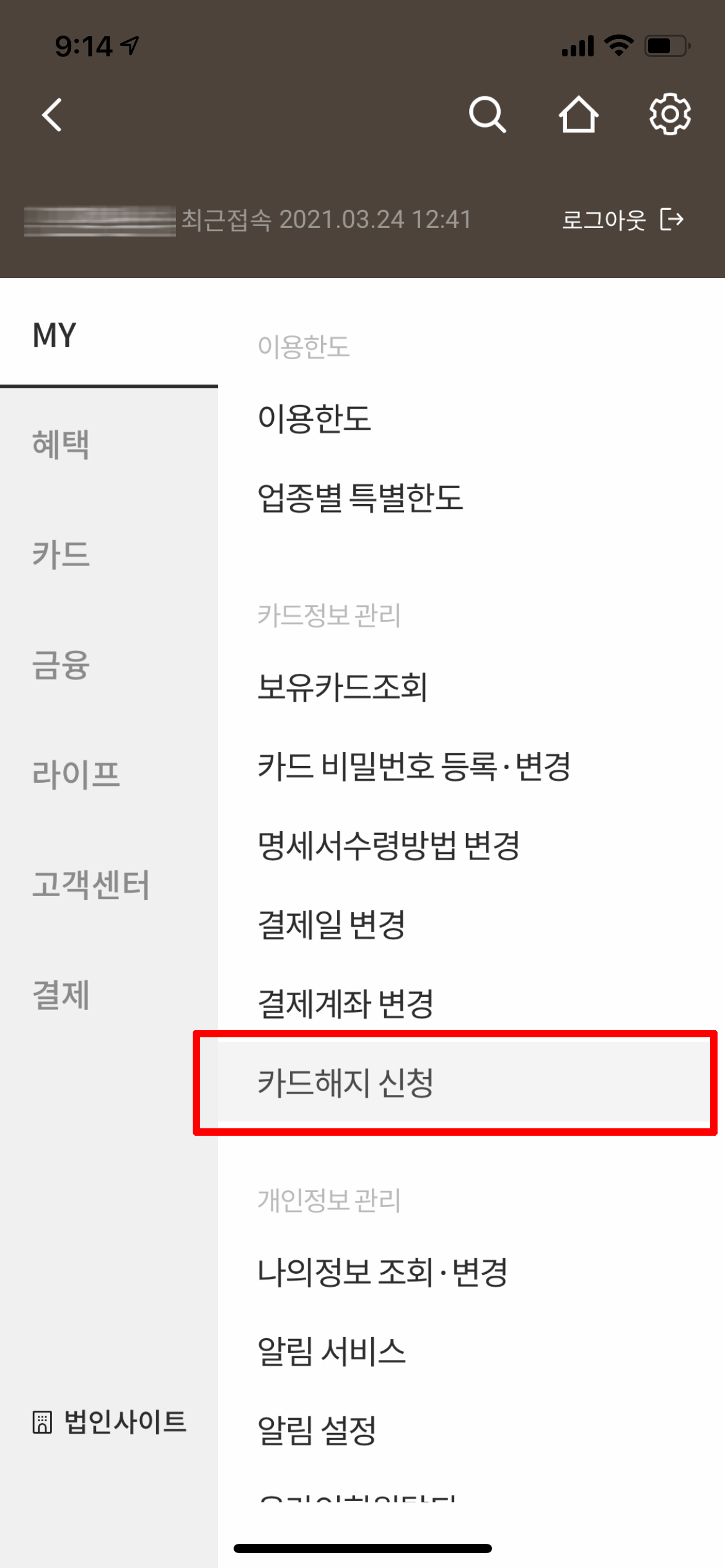 * 나중에 알고보니 신용카드 기준으로 1장만 남은경우, 전화로 해지해야 한다고 한다.
