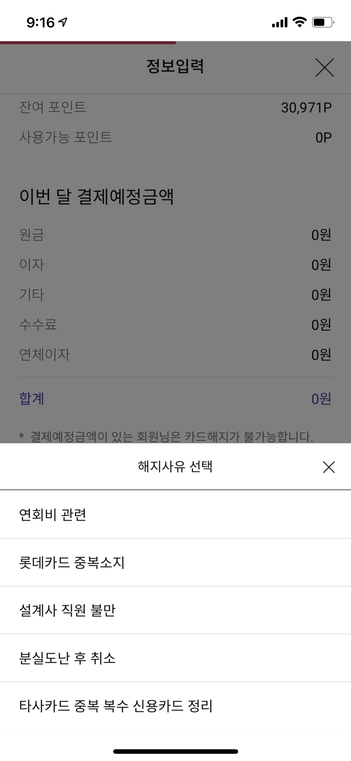 자 그럼 해지해야 할 카드를 잘 선택하고, 해지 사유도 선택해주고...