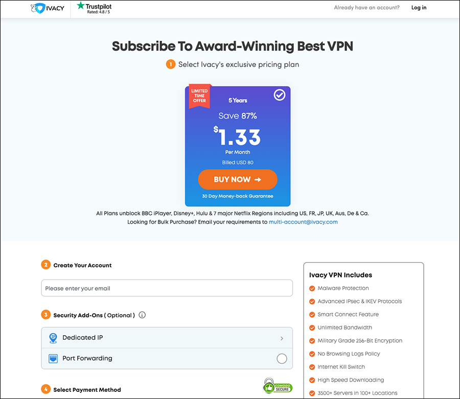 새롭게 나타난 플랜을 클릭해 보면 월 1.33$ (약 1,500원)만 과금되기에, 1년에 15.96$ (1만 8천원) 정도만 요금을 내면 되는 초저가 VPN을 쓸 수 있게 됩니다. 게다가 위에서 테스트해본 것처럼 IVACY는 속도도 매우 빠른 편이죠. 5년 요금이 80$밖에 안하니까... 정말 싼 VPN이라 할 수 있습니다.