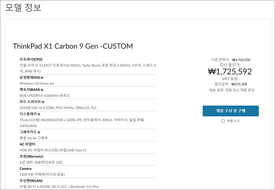 결과적으로 약 6만원 정도를 더 할인 받은 166만원에 씽크패드 X1 카본 9세대 기본형 모델을 살 수 있다.