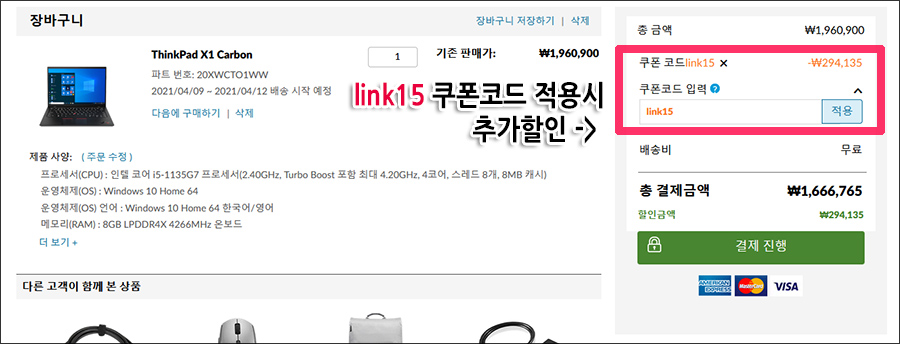 쿠폰코드를 적용하는 방법은 '장바구니'에서 '쿠폰코드 입력'란에 입력하는 방식이다. 씽크패드 X1 카본 9세대 기본형의 가격은 172만원부터 시작하지만, 아래처럼 쿠폰코드 'link15'를 모두 소문자로 기입하면 추가 할인가격으로 구입이 가능하다.
