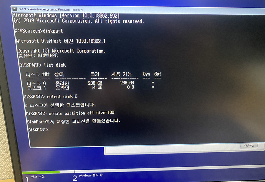 만약 'MSR 및 EFI 파티션은 GPT 디스크에서만 지원됩니다. 선택한 디스크를 GPT로 변환하고 다시 시도하십시오.'라는 에러메시지가 뜬다면, 바로 'convert gpt'라는 명령어를 치고 다시 위에 명령어를 치면 됩니다.