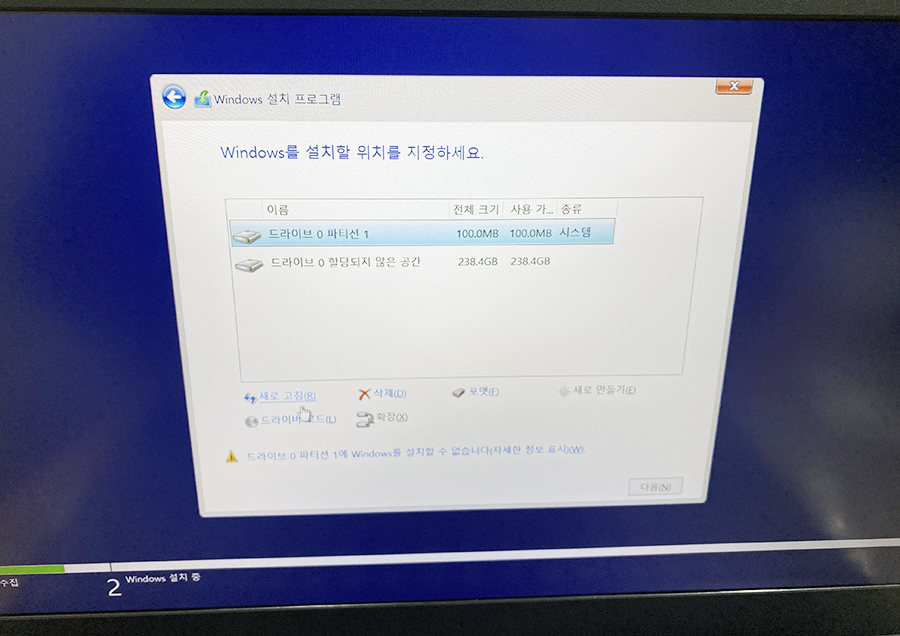 exit 명령어로 diskpart를 나온 뒤, 창을 닫고 윈도우 설치로 돌아와서 '새로고침'을 눌러보면 위와 같은 화면으로 되어 있을 겁니다.