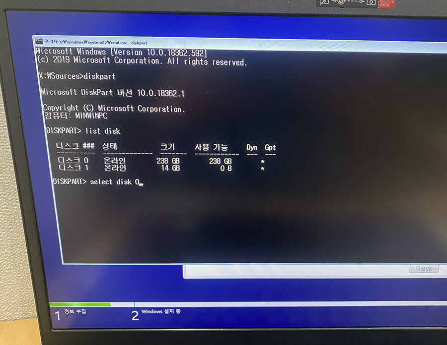 일단 파티션을 모두 날려버린 디스크를 선택합니다. 명령어는 select disk 0 (디스크 0이 윈도우 설치를 하려는 SSD인 경우)