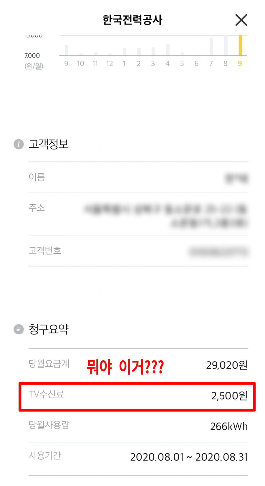 그런데 속았습니다. KBS한테 속은 것인지, 한국전력공사한테 속은 것인지는 모르지만, 은근슬쩍 작년 9월 부터 없던 TV수신료를 물리고 있었네요.