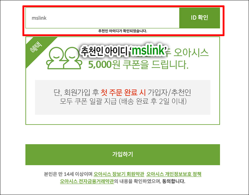 위에 링크를 통해 이동하셨다면, 이미 추천인 아이디 mslink가 적혀 있을 것입니다. 'ID 확인'을 누르고 추천인 아이디가 확인되었다는 메시지가 나오면, 가입하기를 클릭하면 끗이죠. ^^
