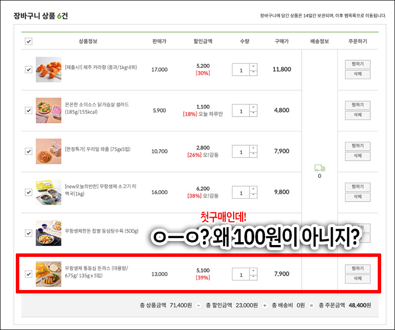 아무래도 첫주문은 첫주문 100원 상품을 구입할 수 있기에 중복 할인이 된다고 생각하나봐요. 그래도 나중에 쓸 수 있는 1만원 쿠폰이 생긴다고 하니 추천인 아이디 'mslink'가 기입되어 있는지 꼭 확인하는 것이 좋겠죠.