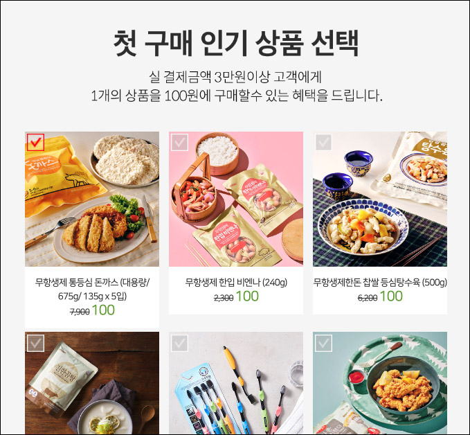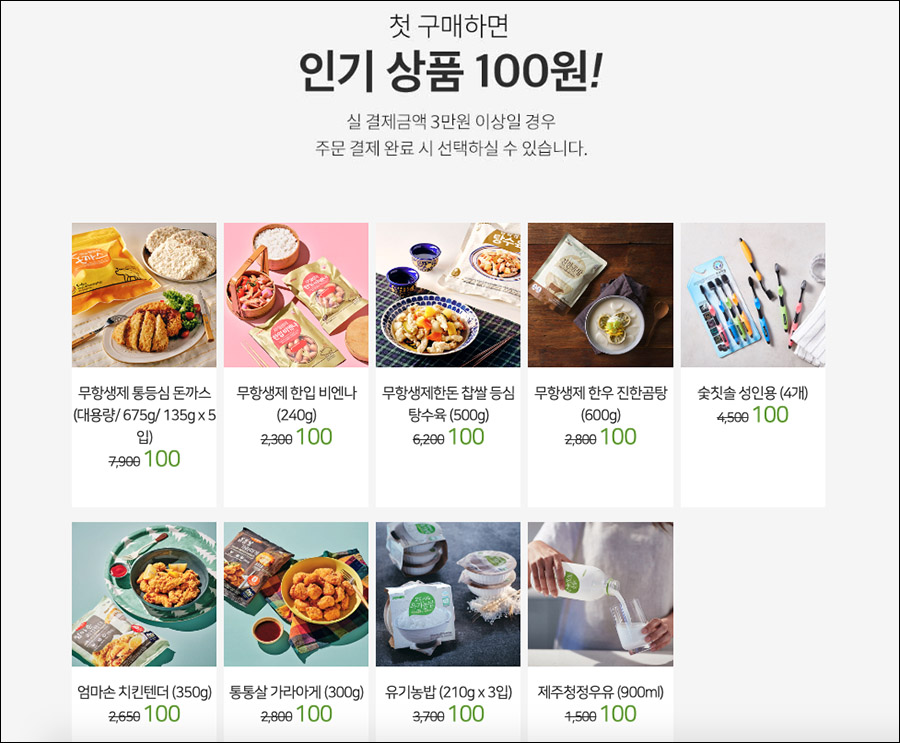 첫구입시 3만원 이상일 경우, 위에 보이는 상품들을 단돈 100원에 주문할 수 있습니다.