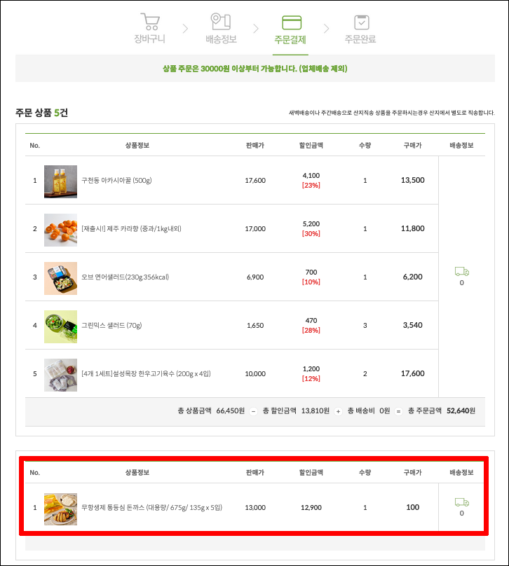 위에 보이시는 것처럼 100원에 잘 장바구니에 들어갔군요. 흥미롭게도 3만원 이상부터 새벽배송이 되나 봅니다. 3만원 이상이면 무료배송이구요. (그럼 배송료는 언제 내지??)