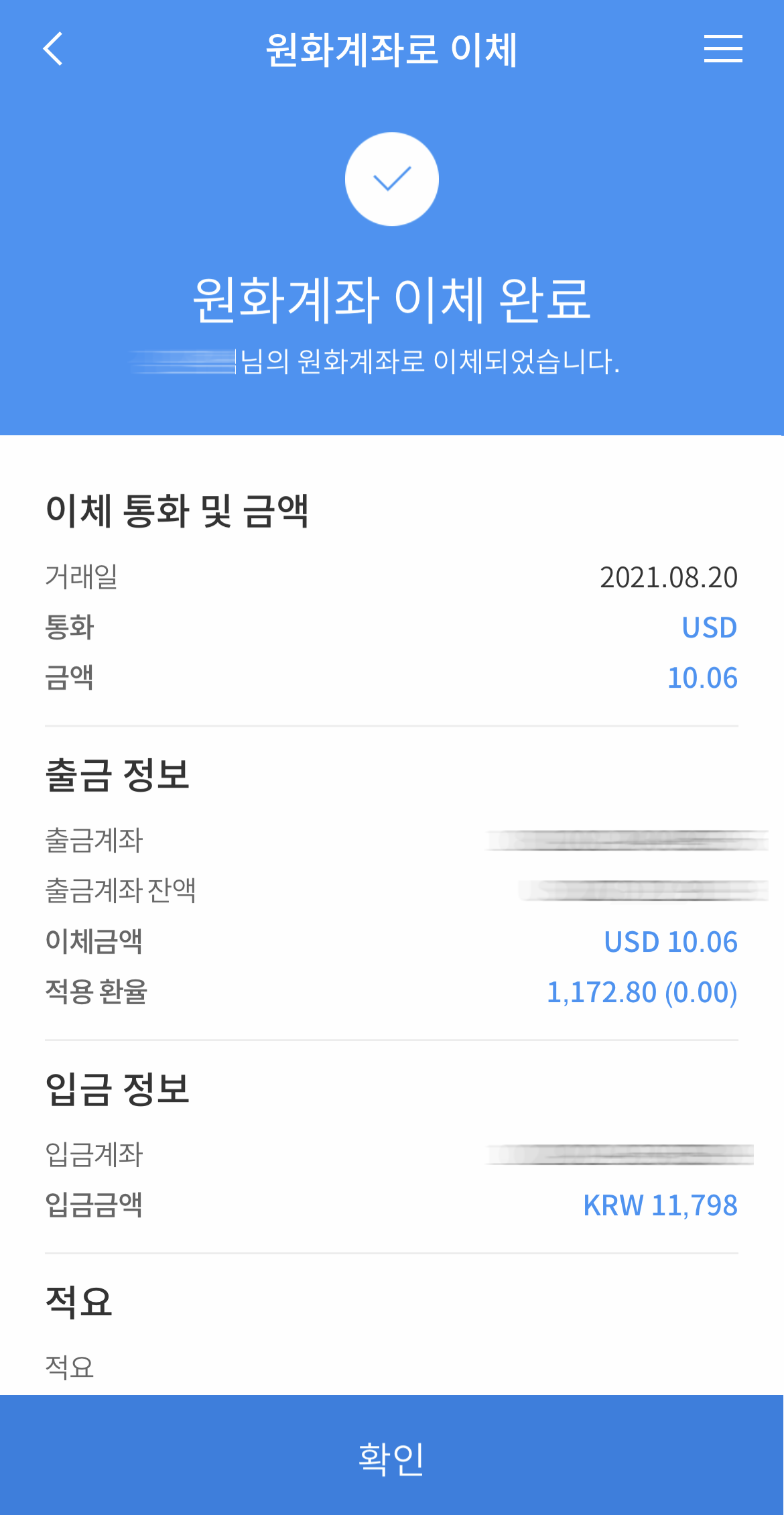같은 금액 10.06$를 우리은행에서 해보니 적용환율 1172.80해서 11,798원이 되었습니다.