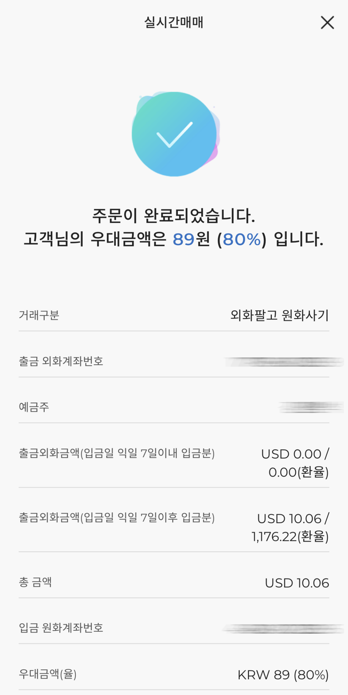 SC제일은행에서는 80% 환율우대를 해줘서 이러한 차이가 생긴 것 같은데... 왜 환율우대가 적용 안되었는지는 잘 모르겠네요. 아마도 달러 예치 기간이나, 이자로 받은 금액이나, 일정 금액 이상에만 적용이 되는 시스템인 것 같습니다.