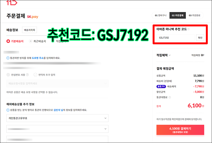 아참, 11번가 아마존 직구를 사실 떄 필요한 추천코드가 필요하신 분들을 위해 공유해드립니다. 제 추천코드는 GSJ7192입니다.
