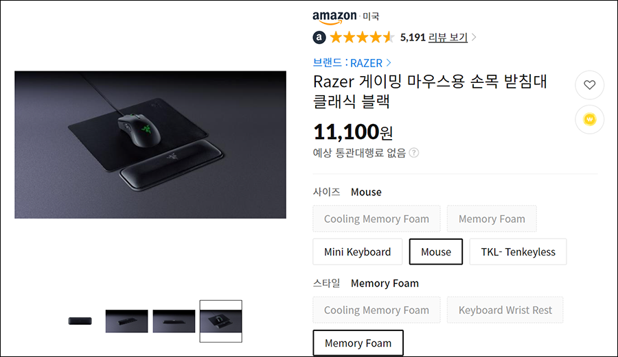 제 경우 두번째 구입한 물품이 Razer에서 만든 마우스 손목받침대 입니다. 손목 건강을 위해서 이런 제품을 챙기고 싶더라구요. ^^ 버티컬 마우스도 많이 쓰는데, 게임이나 정밀한 그래픽 작업을 할 때는 아직 일반 마우스를 많이 쓰기에, 고급 손목받침대가 있으면 좋겠다는 생각을 해서 구입했습니다. 국내 가격은 아마 2배쯤 할꺼에요 ㅎㅎ