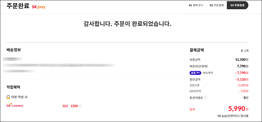 여담으로 저는 지금 활용하고 있는 신한카드 더모아 카드로 더 할인을 받고 싶기에 OK캐시백 포인트를 써서 5990원을 만들었습니다. ㅎㅎ 요렇게 구입을 했구요.
