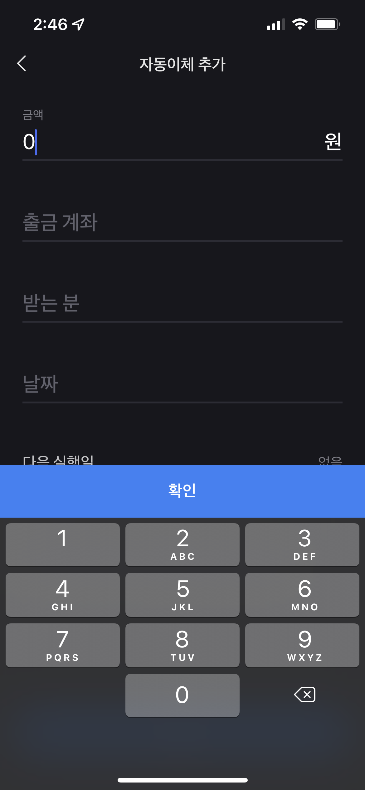 그러면 자동으로 키패드가 뜨는 자동이체 설정 화면으로 들어오게 되는데요. 토스뱅크와 조금 이질감이 드는 UI/UX가 느껴지는 이유는 이게 공통화면으로 되어 있어서 그렇습니다. 토스UX가 좋다고는 하지만 점점 서비스가 커지다 보니까 조금 어색한 부분도 상당히 많이 있는 것 같습니다. 어찌되었든 여기서 금액을 입력하는 것인데.. 중요한 것은... 두번째 항목인 출금계좌를 '토스뱅크 통장'으로 설정해야 한다는 것입니다.