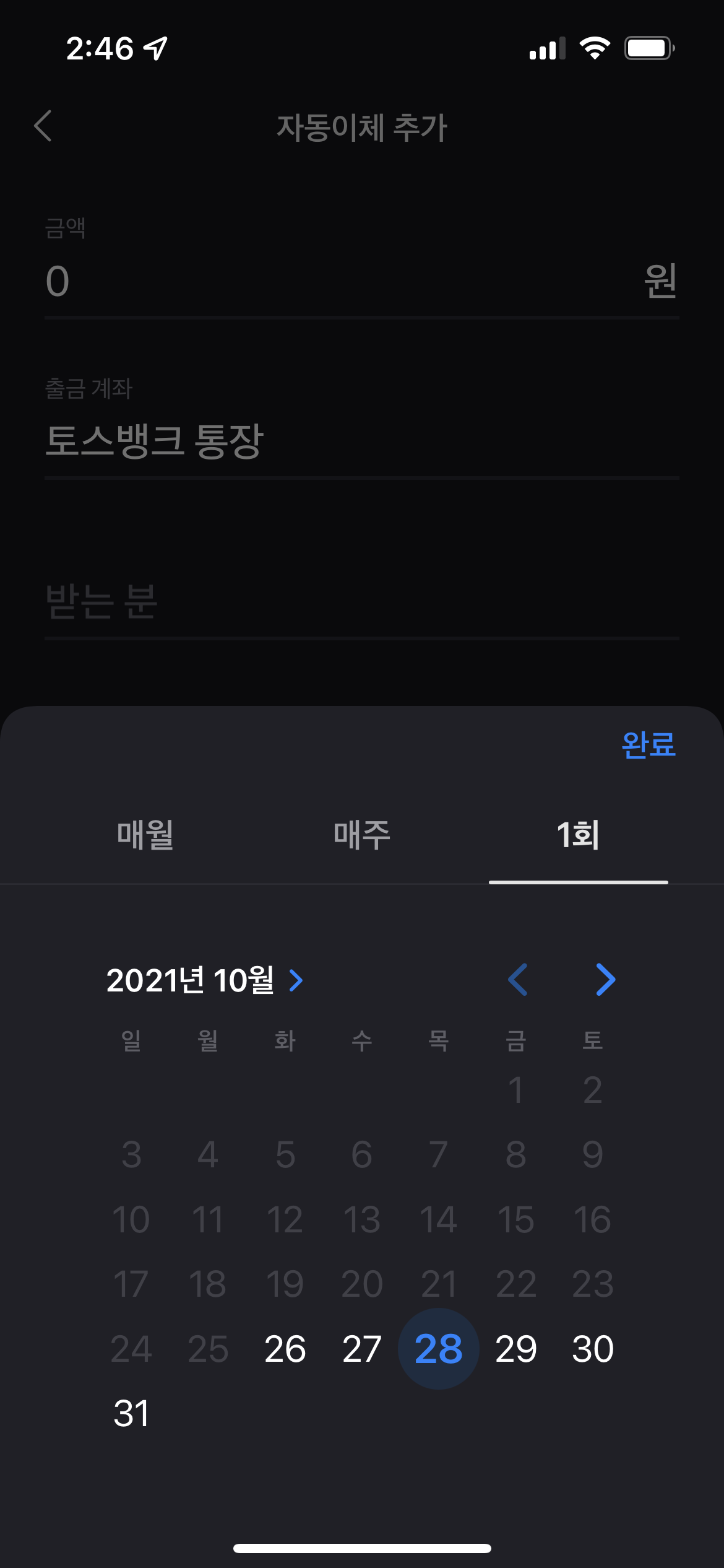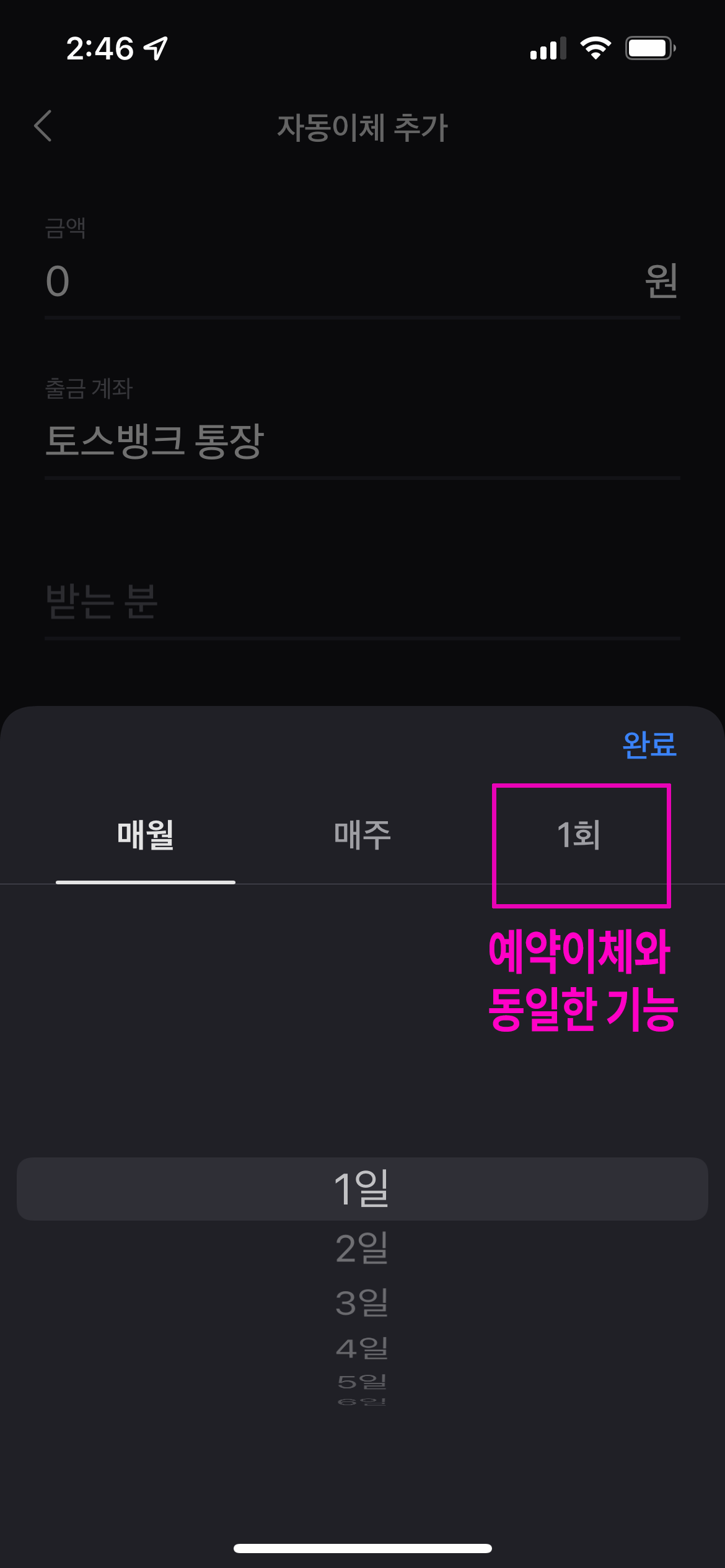자동이체 주기나 날짜등을 설정하기 위해서 '날짜'란 항목을 선택해보면 재밌는 것이 보이는데, 매월 매주 뿐만 아니라 그냥 1회 자동이체도 있습니다. 사실상 1회에서 날짜를 선택하면 그냥 예약이체가 되는 것이죠 ㅎㅎ