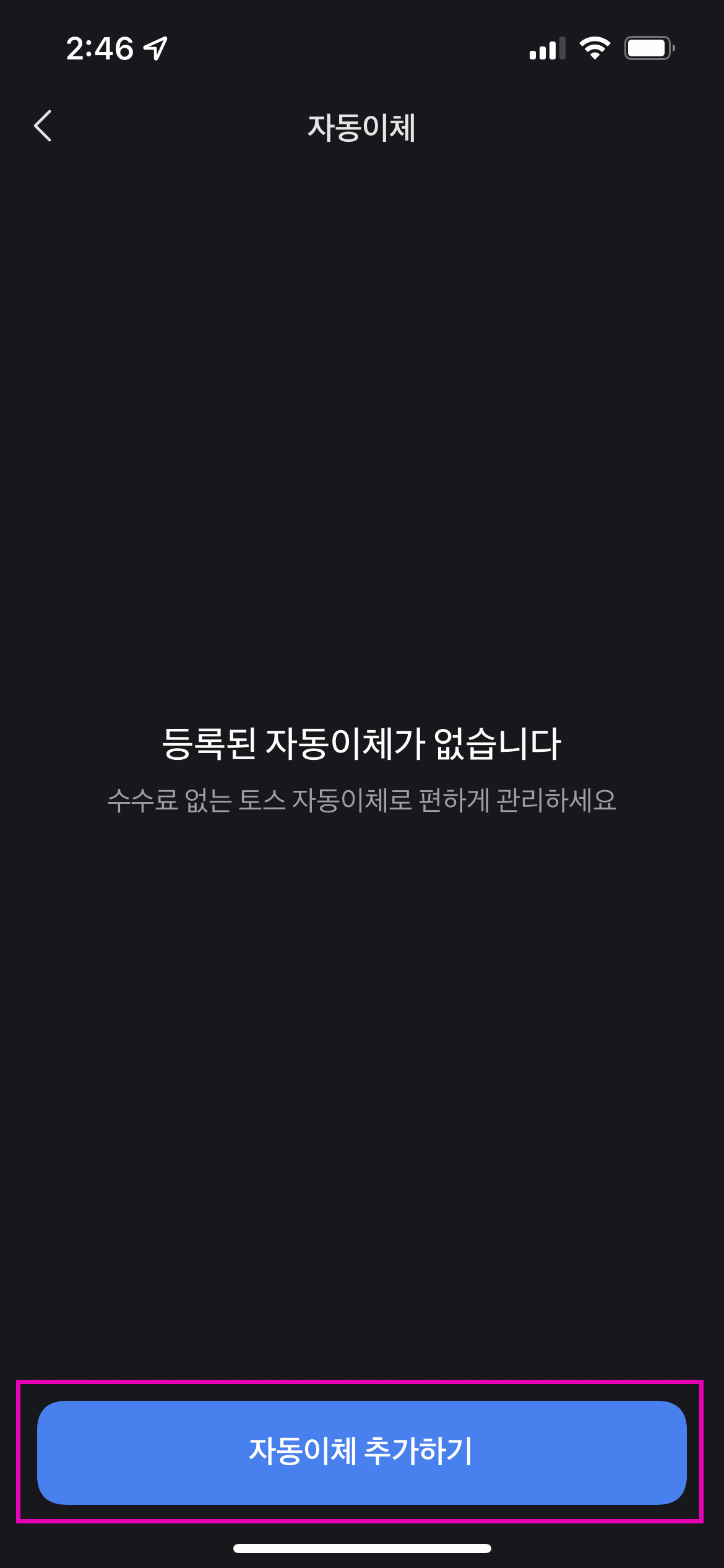 위와 같이 설정 메뉴들 중 '자동이체'라고 쓰여져 있는 걸 볼 수 있습니다. 이걸 눌러보면 '자동이체 추가하기'라는 버튼이 있는 화면으로 진입할 수 있죠.