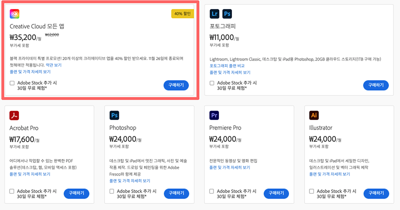 어도비 블랙프라이데이 쎄일을 알고 계셨다면 아래에 링크를 통해 구입하시면 되구요. 혹 이미 어도비CC 구독중이신데 1~2달 안에 구독이 만료되는 분들이라면, 그냥 계정을 새로 파면 됩니다. 그게 더 저렴하게 먹일 수 있으니까요.