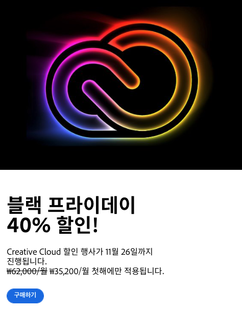 어도비 블랙프라이데이 쎄일을 알고 계셨다면 아래에 링크를 통해 구입하시면 되구요. 혹 이미 어도비CC 구독중이신데 1~2달 안에 구독이 만료되는 분들이라면, 그냥 계정을 새로 파면 됩니다. 그게 더 저렴하게 먹일 수 있으니까요.