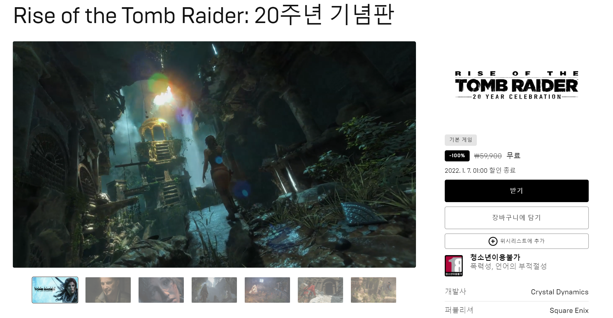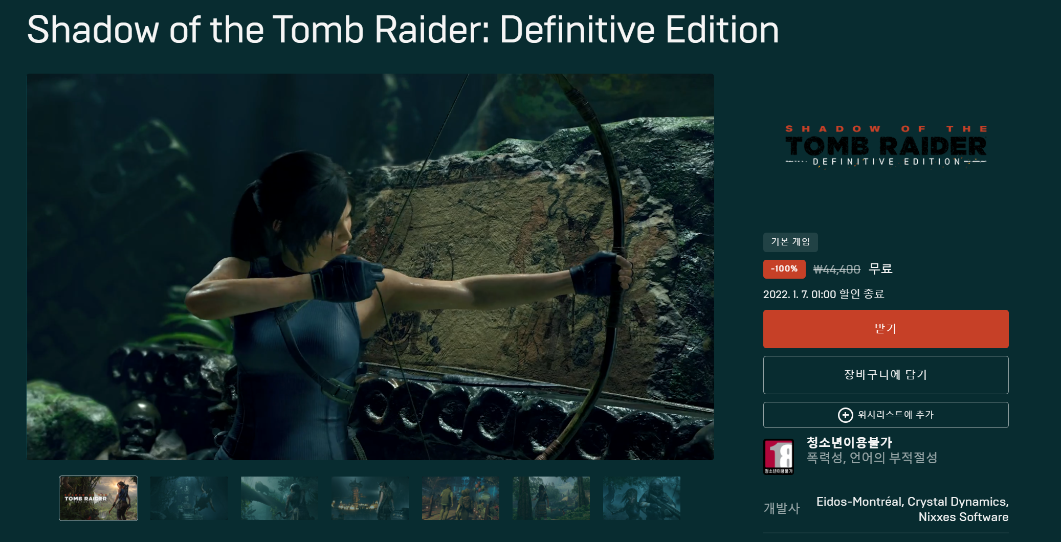 역시 에픽 게임스(EpicGames)네요. 툼레이더 3종을 2022년 1월 1일 기념으로 모두 풀어버렸습니다.