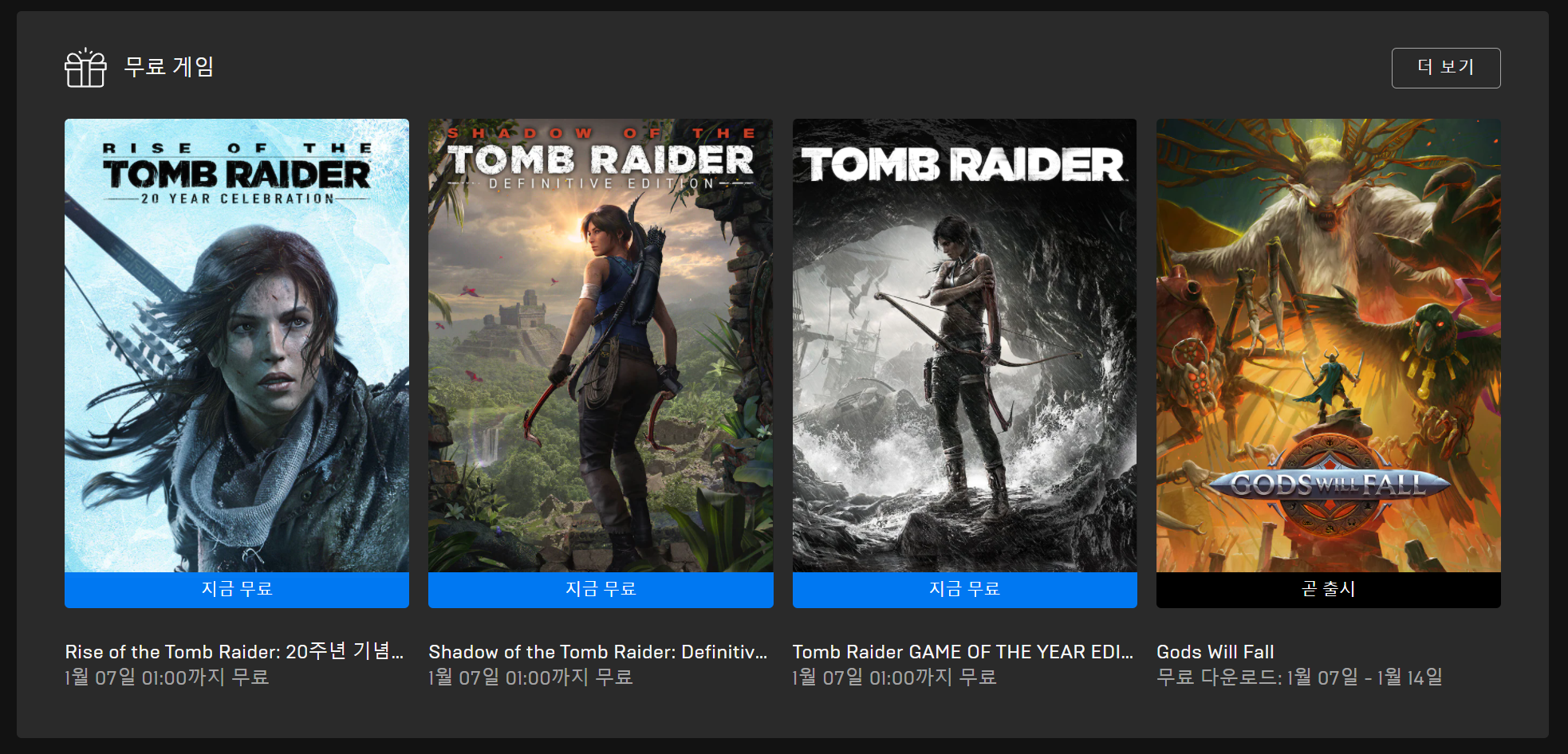 위와 같이 Rise of the Tomb Raider, Shadow of the Tomb Raider, Tomb Raider GOTY에 '지금 무료' 버튼이 부터 있습니다. ㅎㅎ