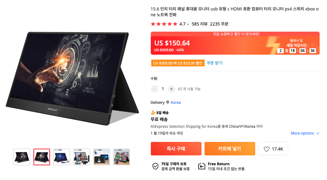 많은 IT 매니아들이 좋아하는 제우스랩 외장 모니터 입니다. 휴대용 세컨 디스플레이가 필요한 분들이 찾게 되는데요. 터치도 지원하고... 여타 다른 콘솔 게임기기와 연결해 사용하기에도 좋죠. 150$면 살 수 있는 가성비 제품이며, 아래 특별 할인 쿠폰을 적용하시면 더 저렴하게 구입이 가능하실 겁니다. :)