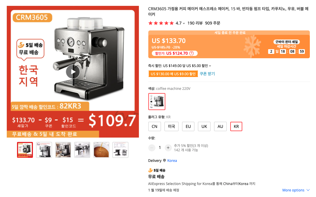 가성비가 매우 좋은 CRM3605 커피머신입니다. 플러그를 KR를 고르면 한국형 어댑터로 출고된다 하네요. 5일 빠른 배송이 가능한 상품이기도 하기에 5일 특별 할인코드인..